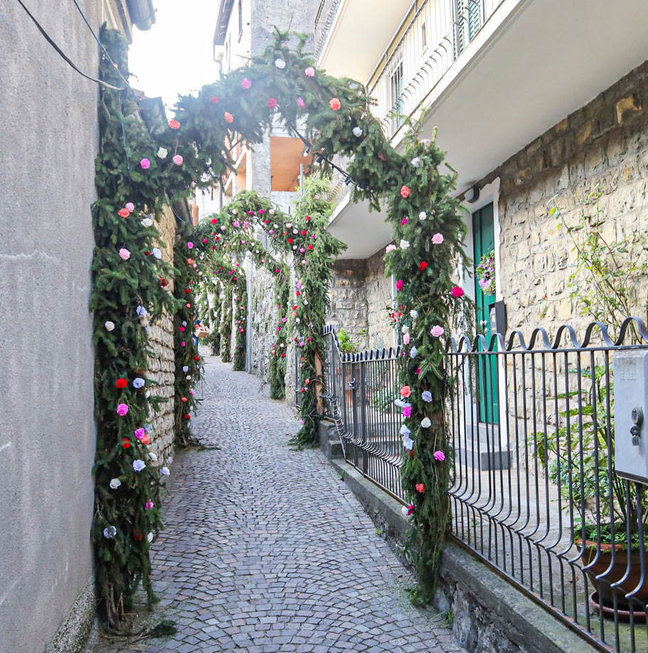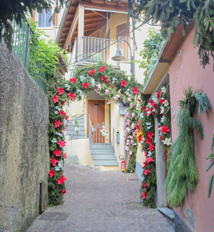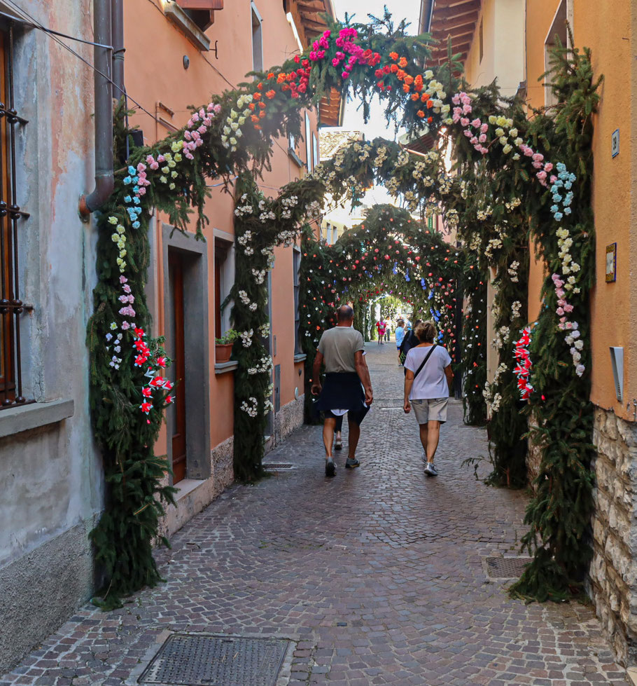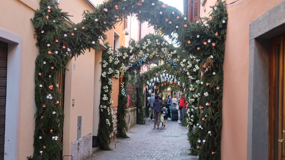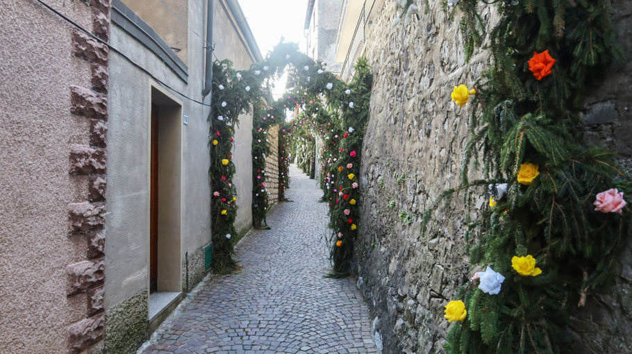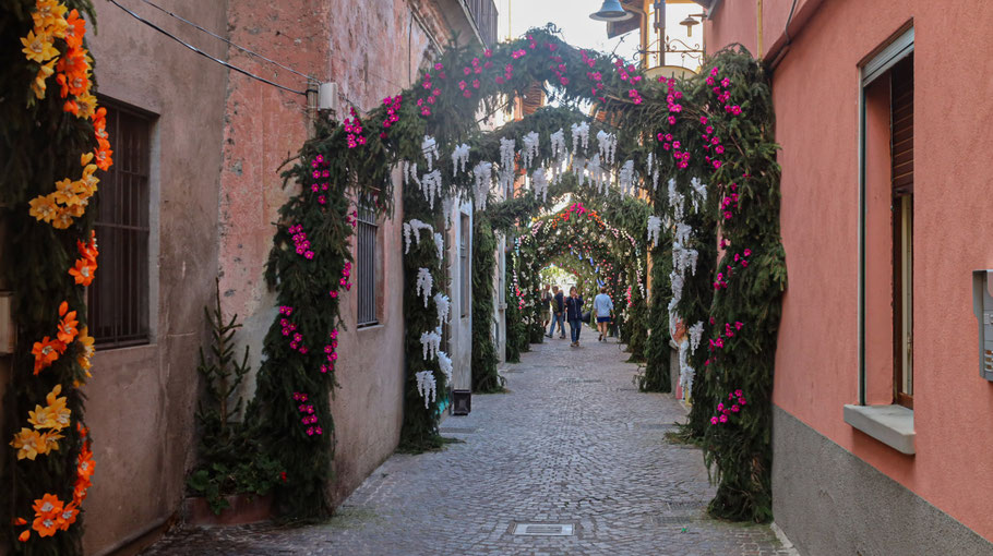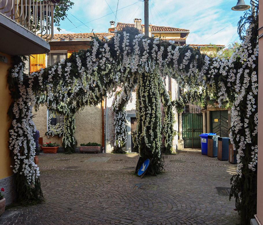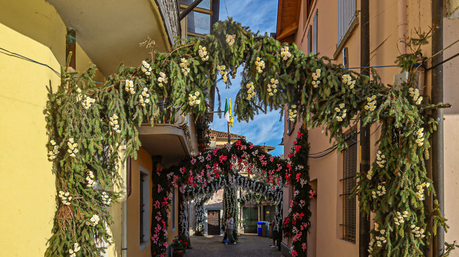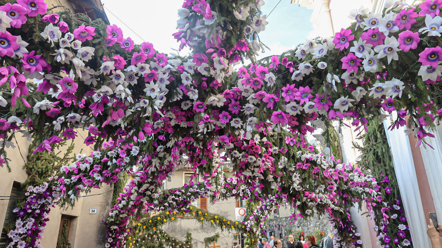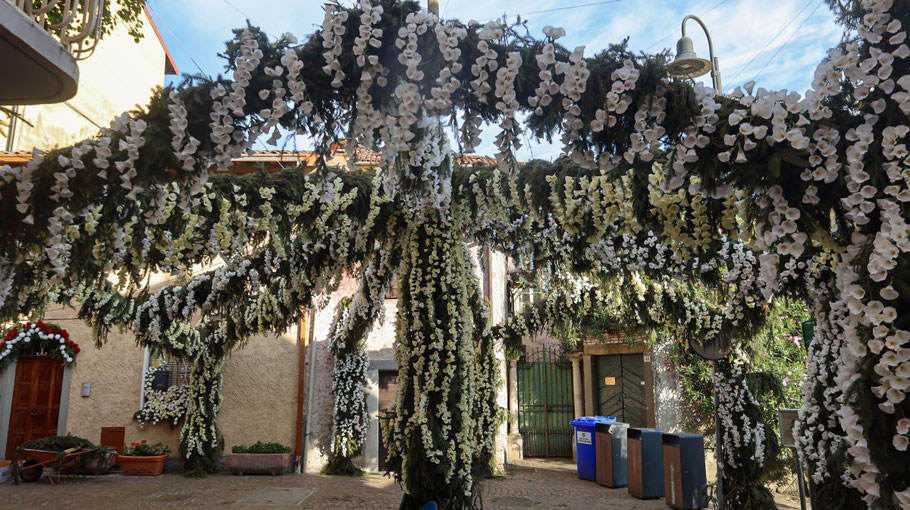 Per questa occasione i vicoli e le piazzette si trasformano in un bosco incantato: arcate di legno ricoperte di rami di pino e fiori coloratissimi.