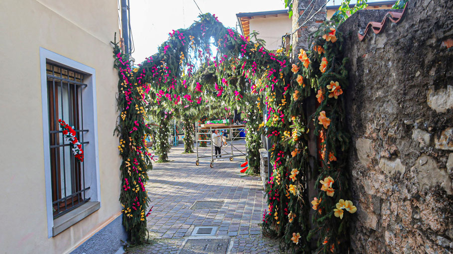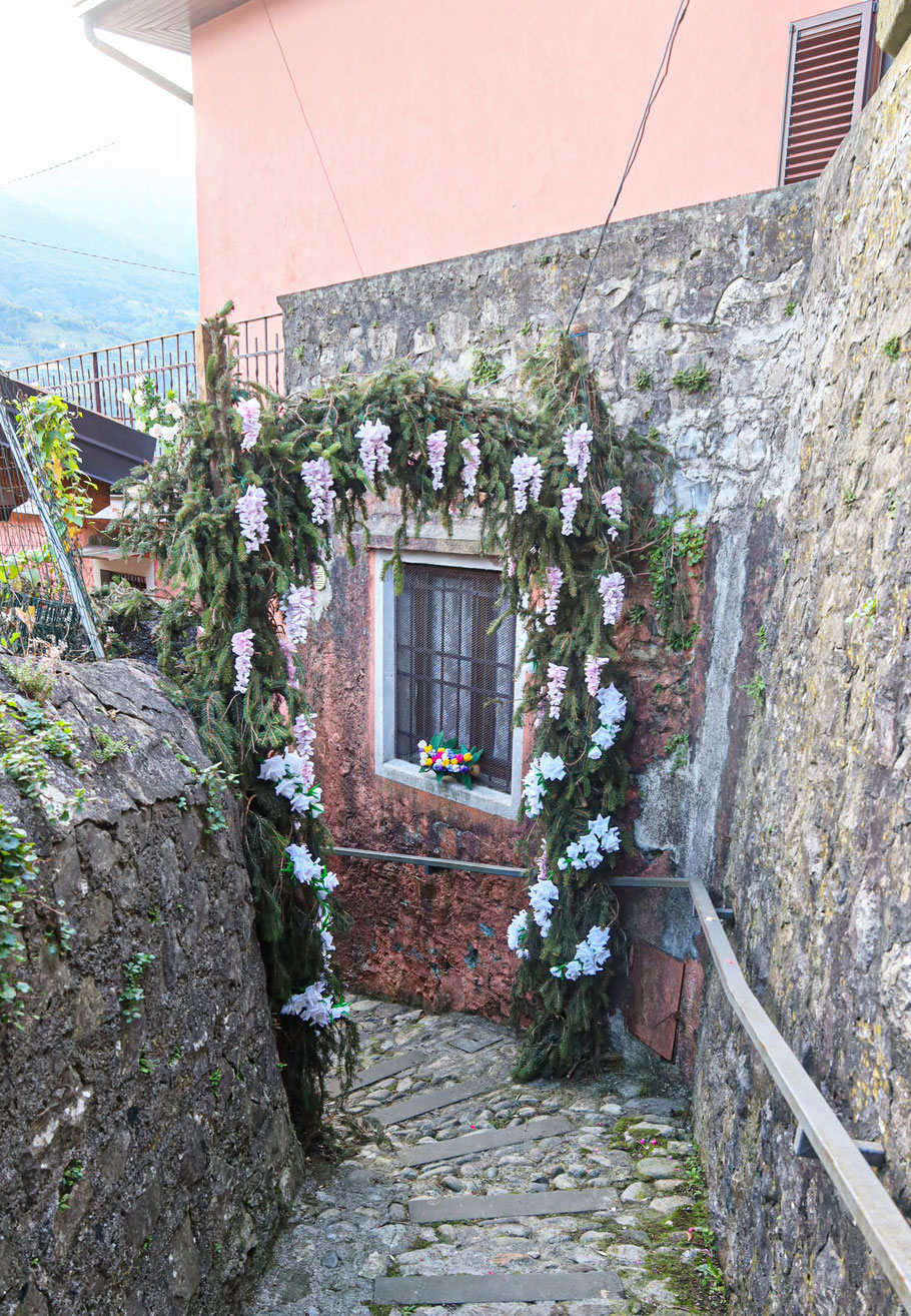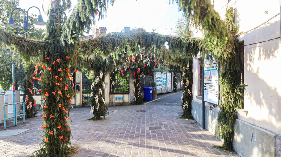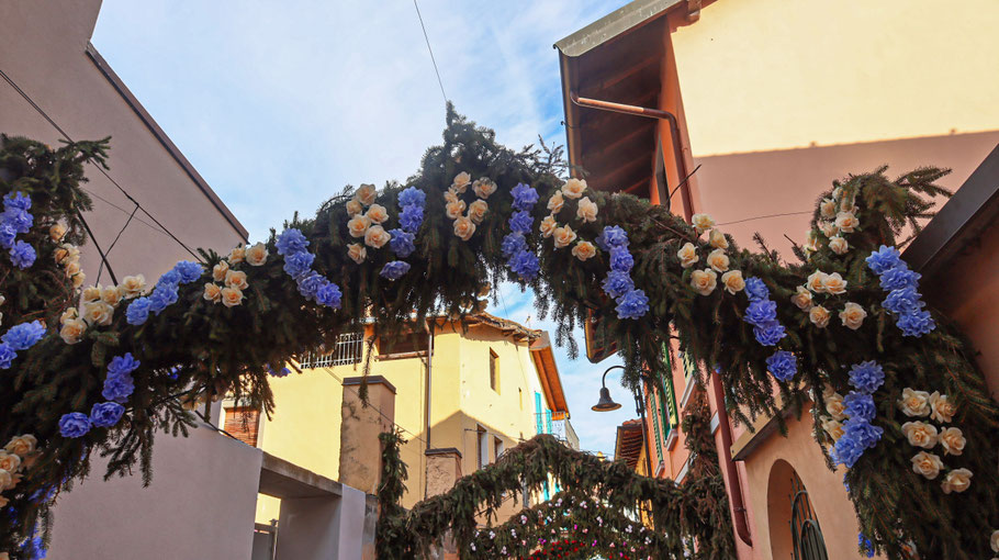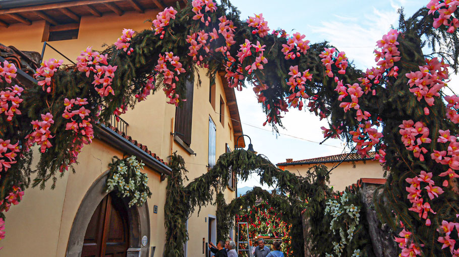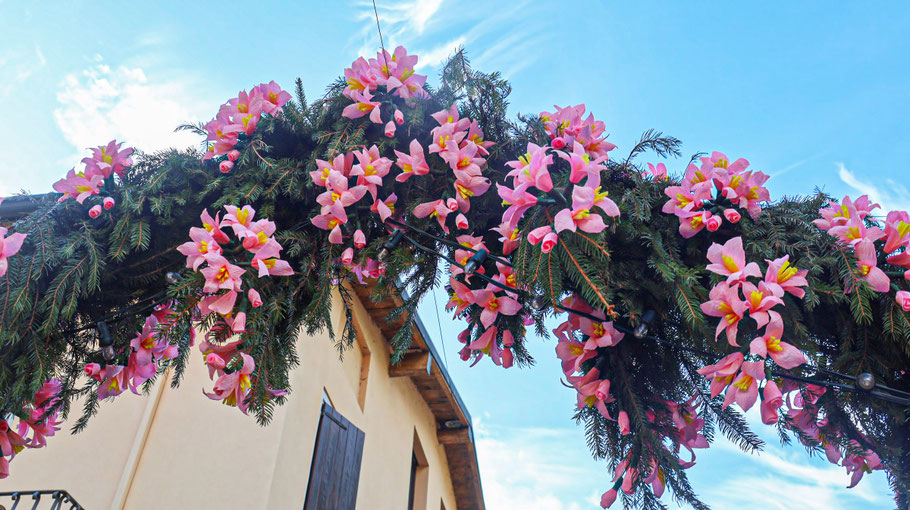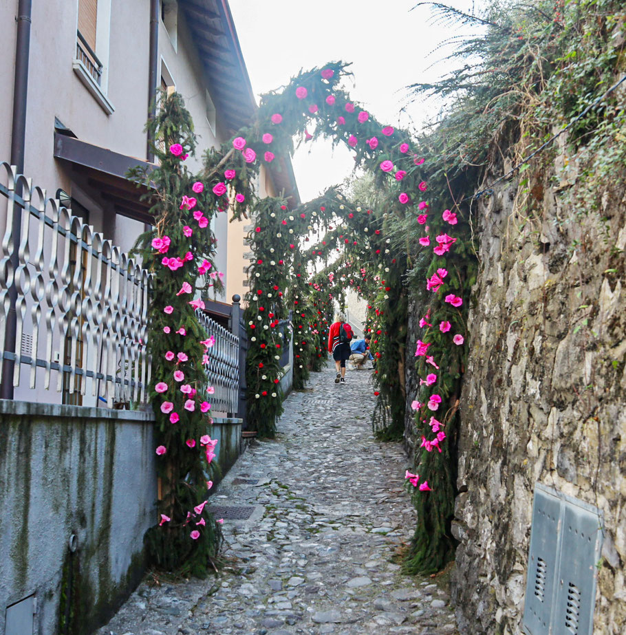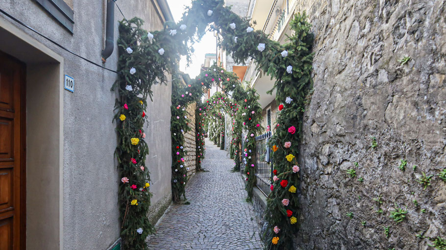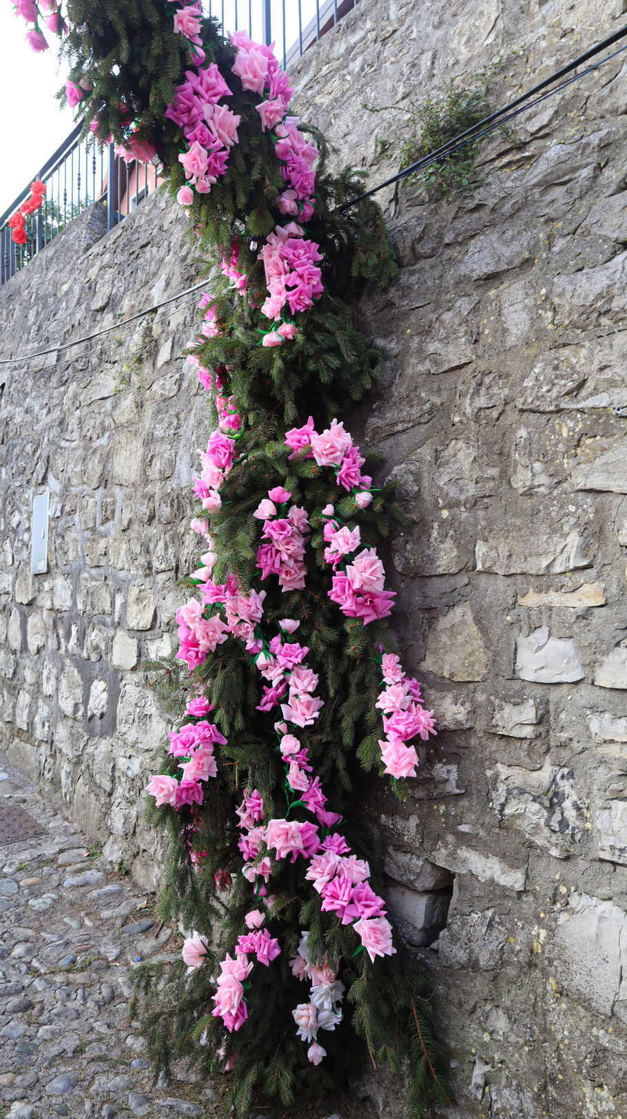 Per questa occasione i vicoli e le piazzette si trasformano in un bosco incantato: arcate di legno ricoperte di rami di pino e fiori coloratissimi.