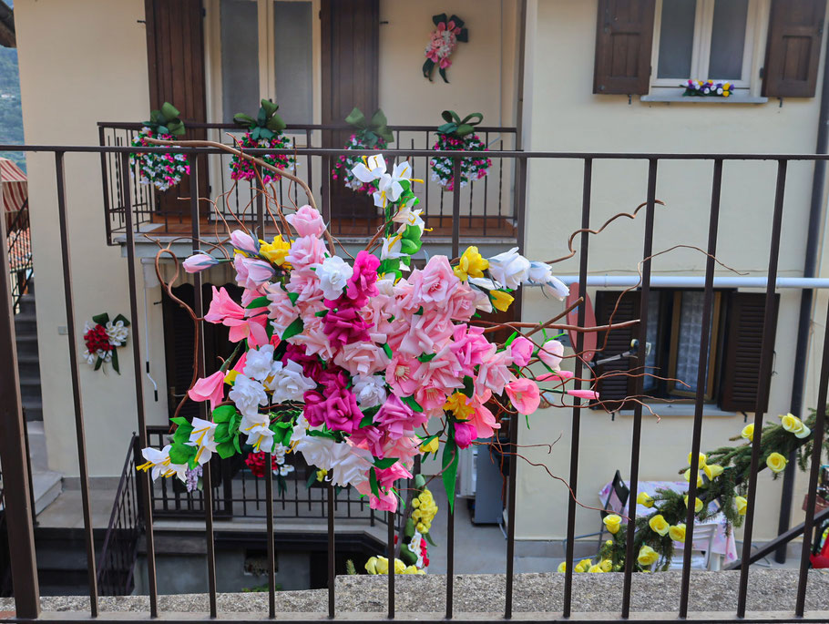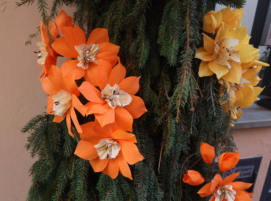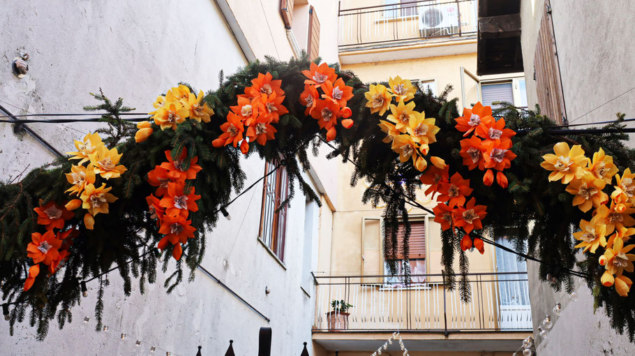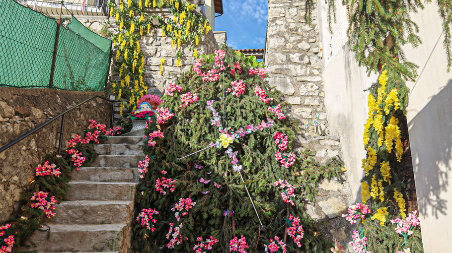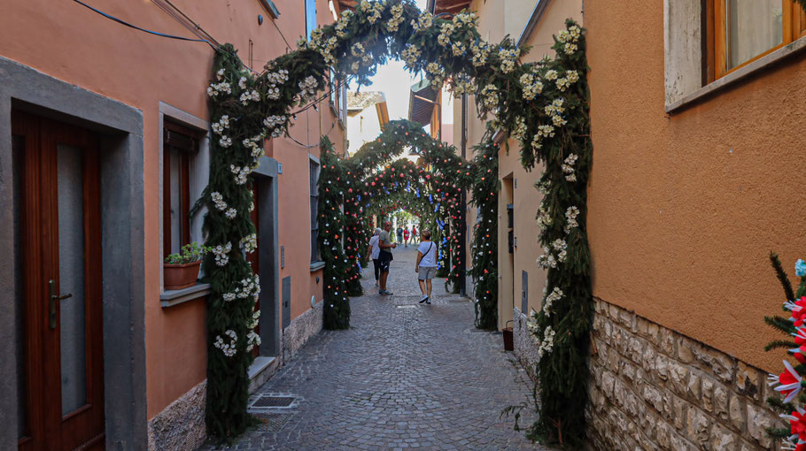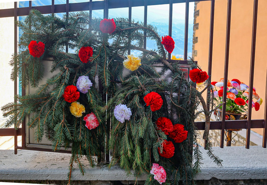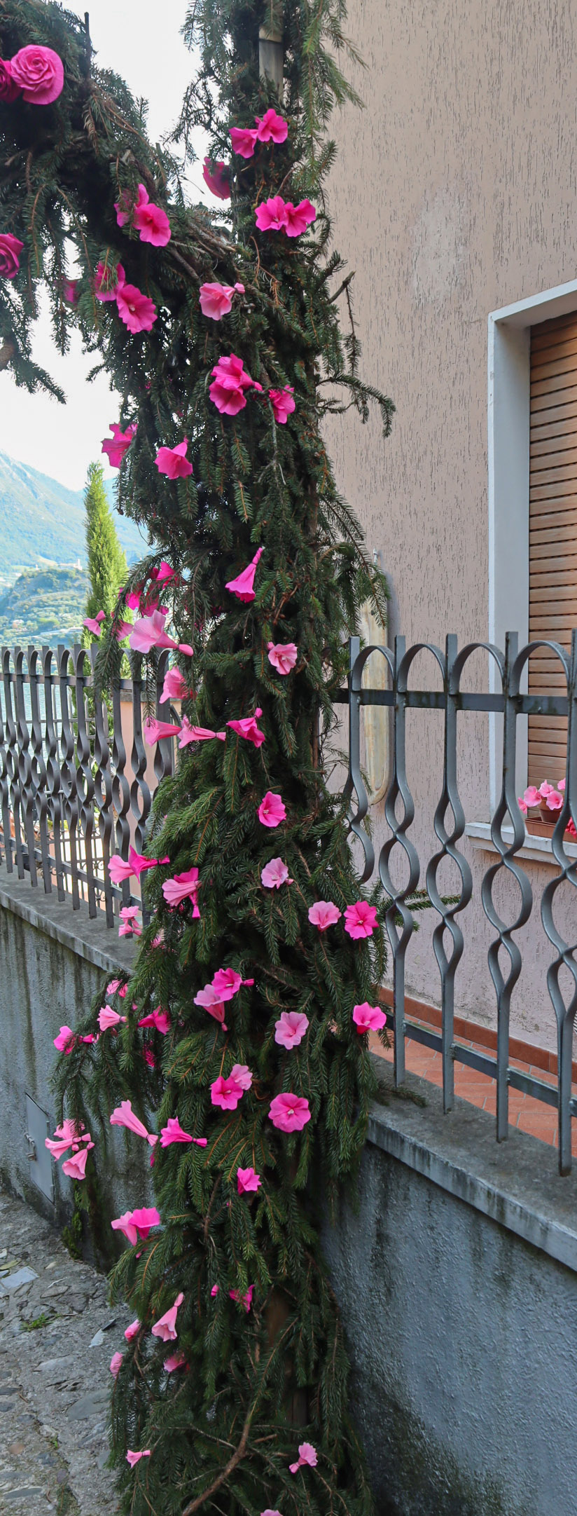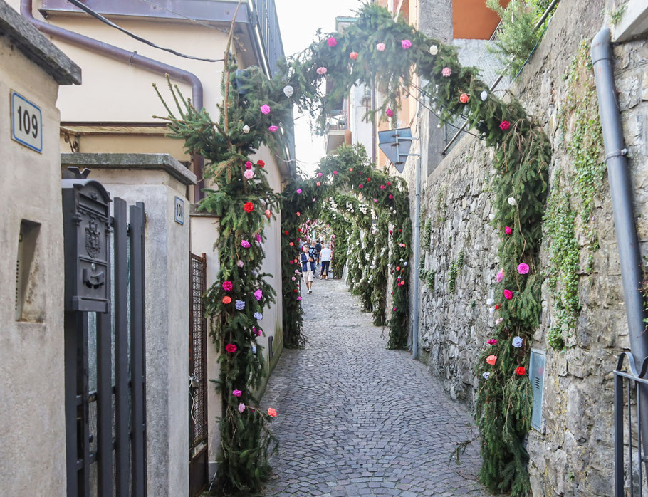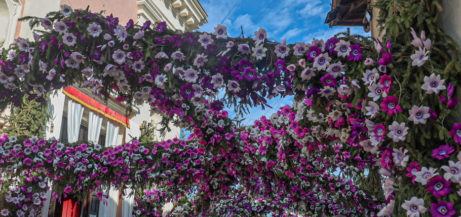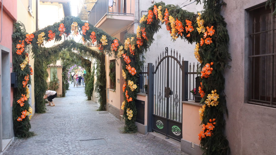 Per questa occasione i vicoli e le piazzette si trasformano in un bosco incantato: arcate di legno ricoperte di rami di pino e fiori coloratissimi.