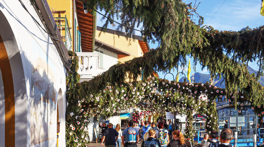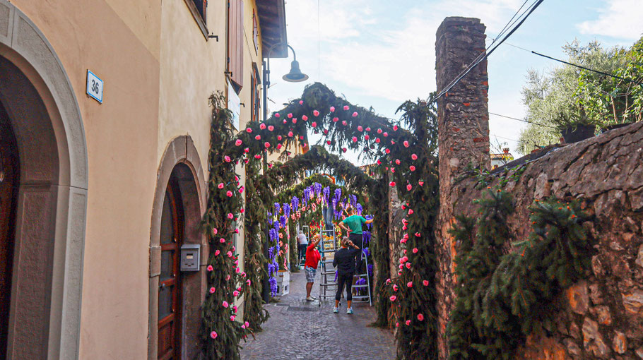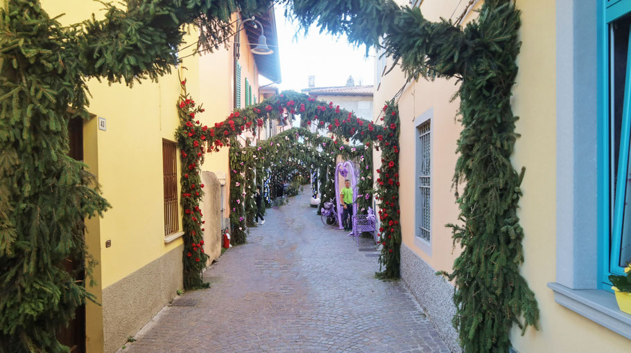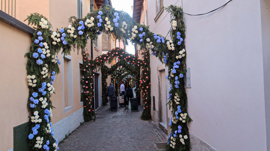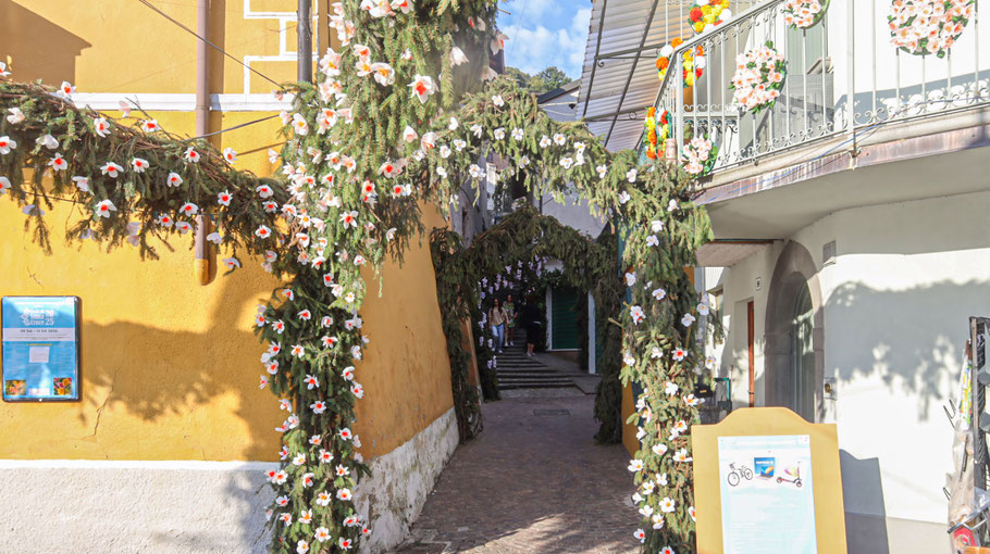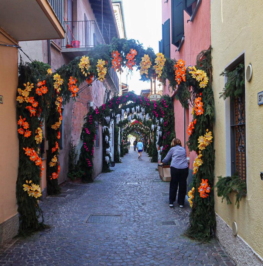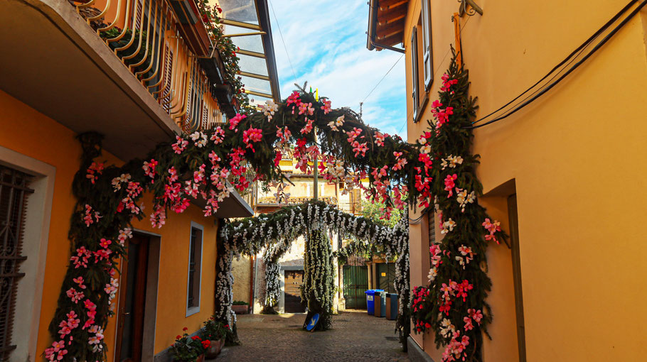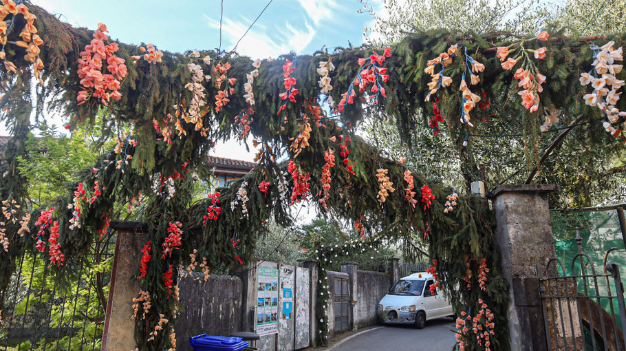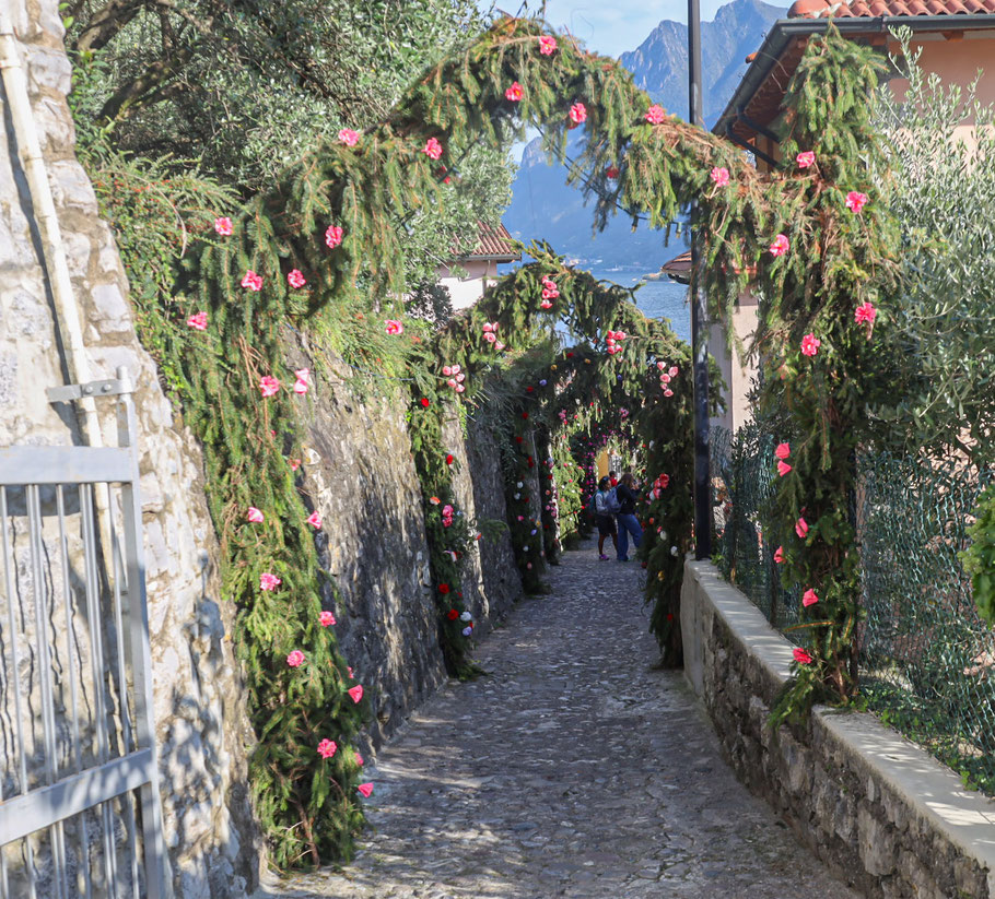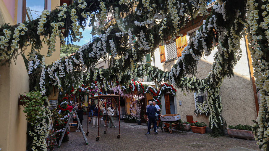 Per questa occasione i vicoli e le piazzette si trasformano in un bosco incantato: arcate di legno ricoperte di rami di pino e fiori coloratissimi.