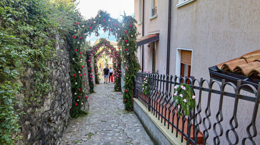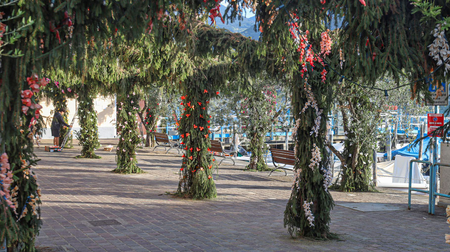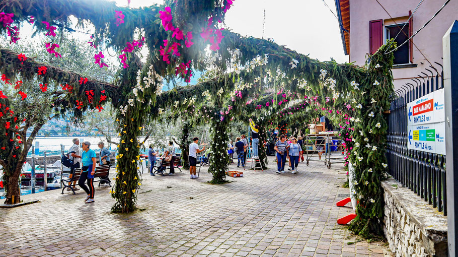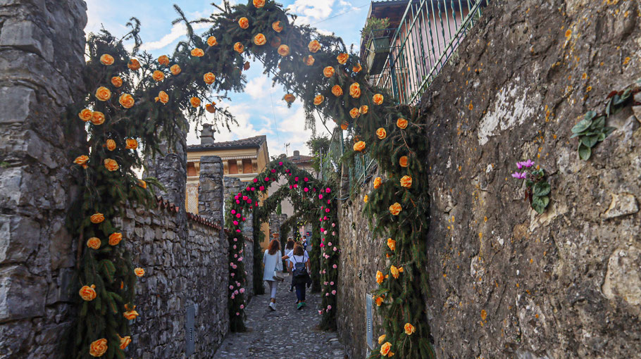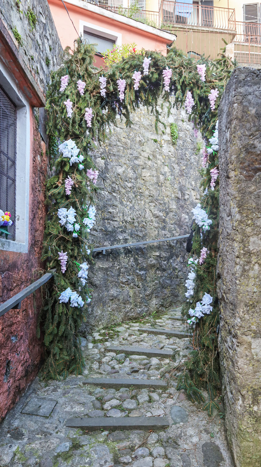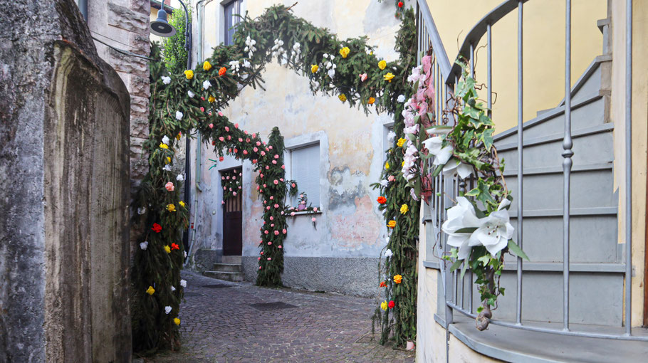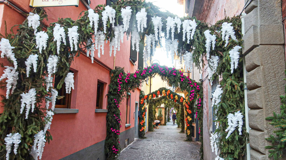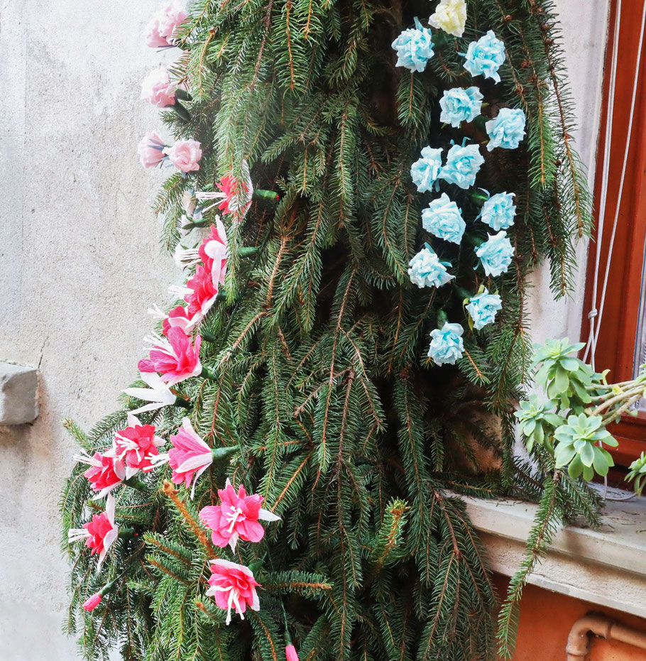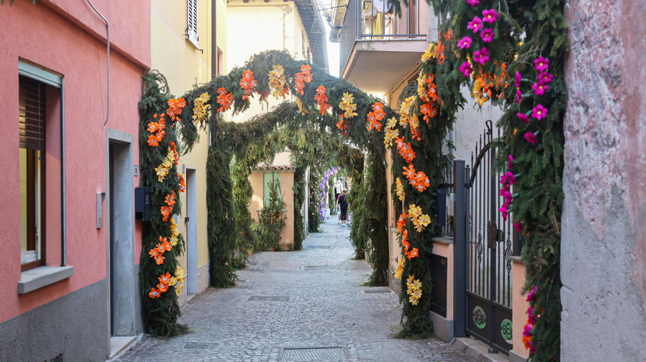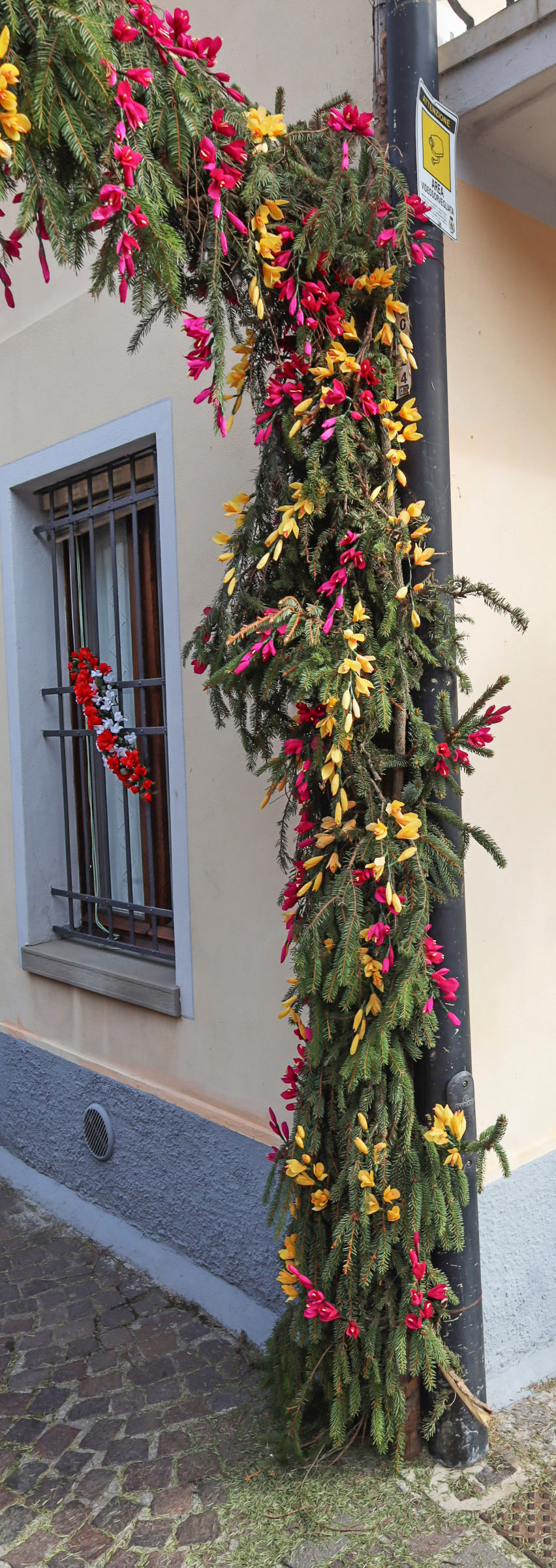 Per questa occasione i vicoli e le piazzette si trasformano in un bosco incantato: arcate di legno ricoperte di rami di pino e fiori coloratissimi.
