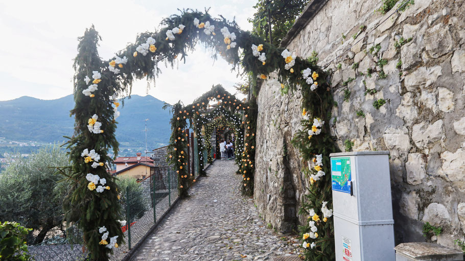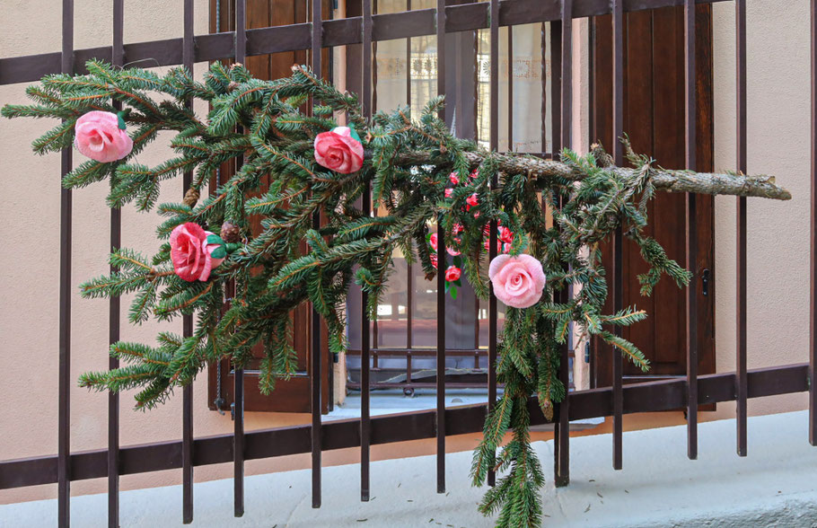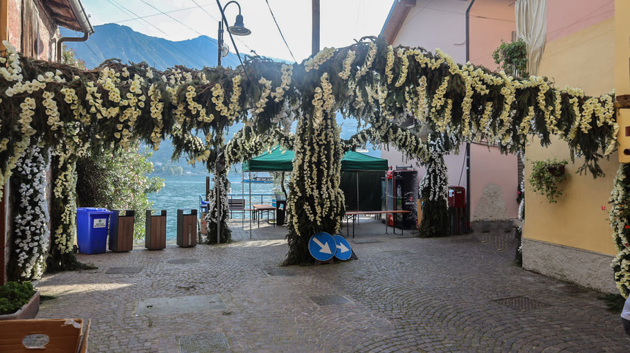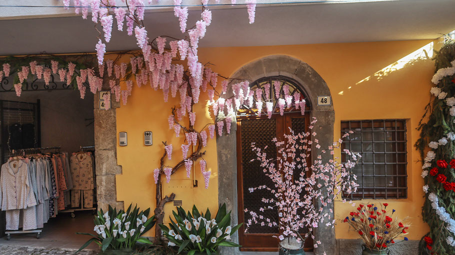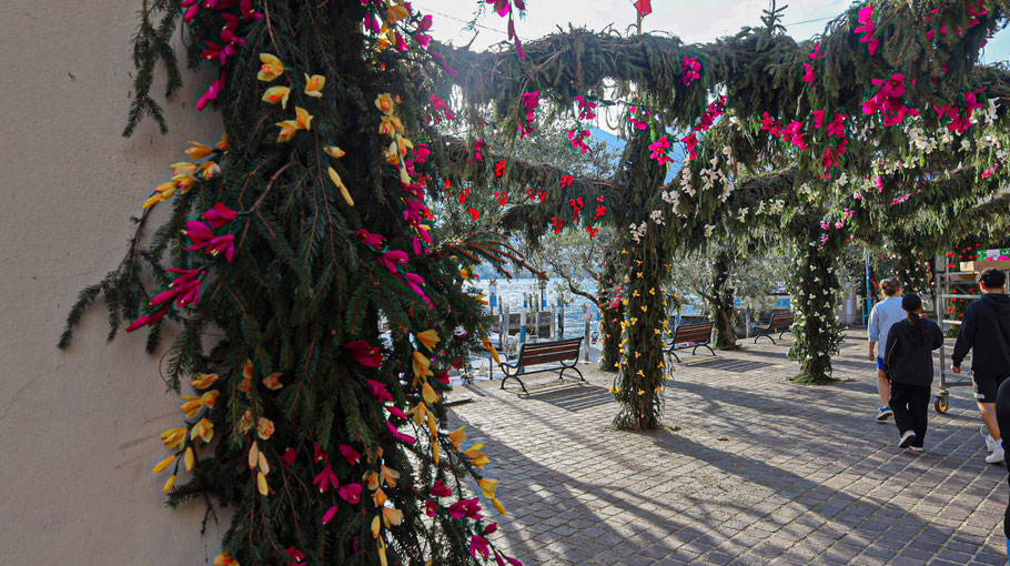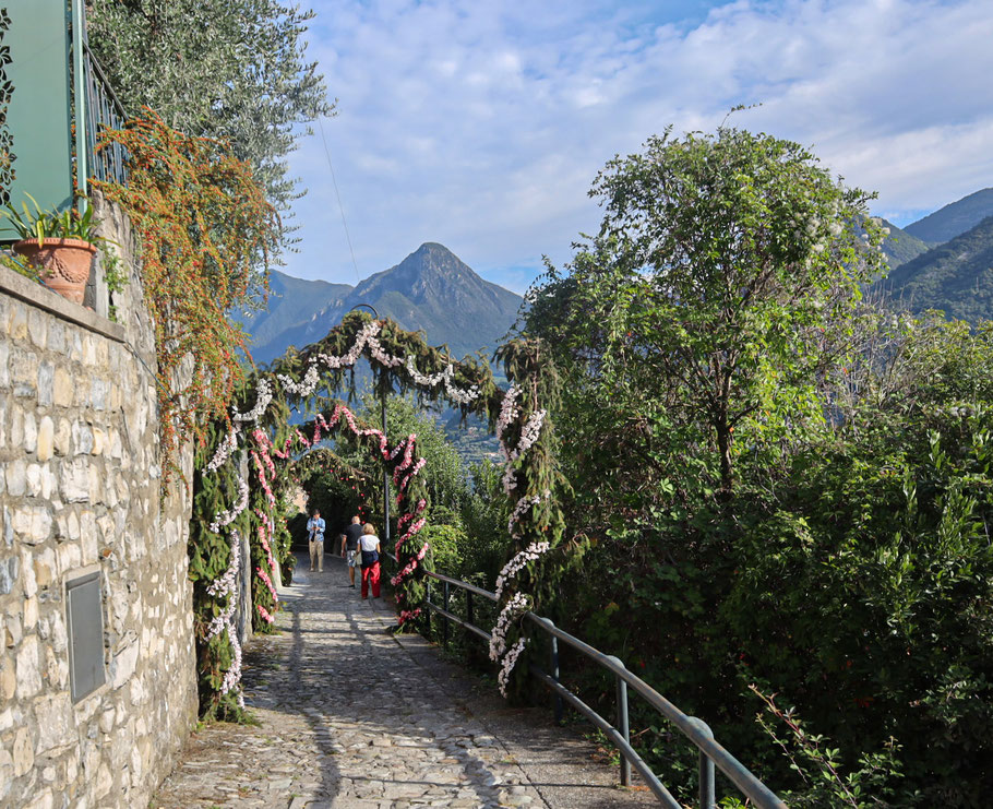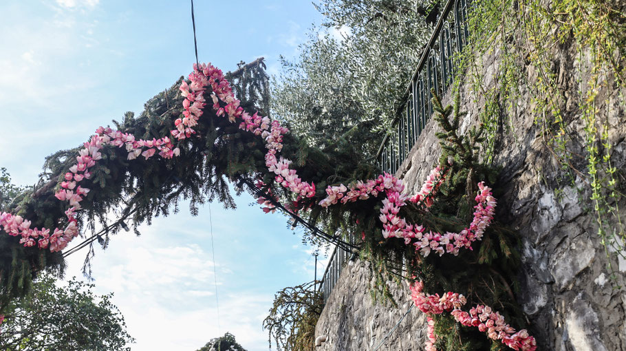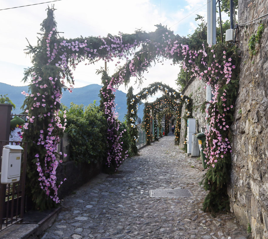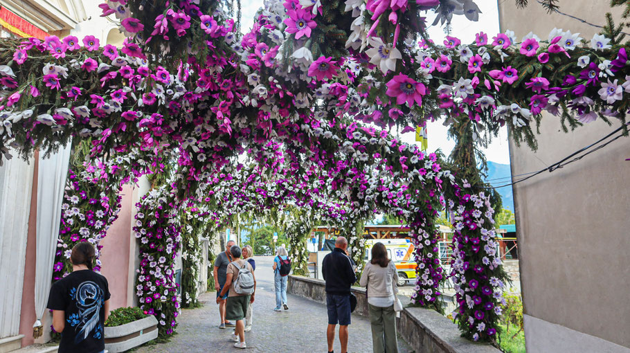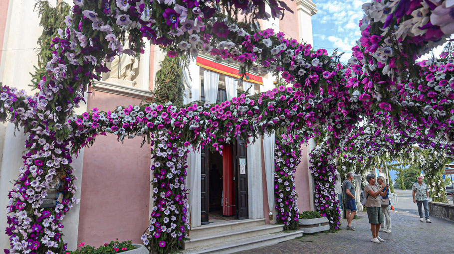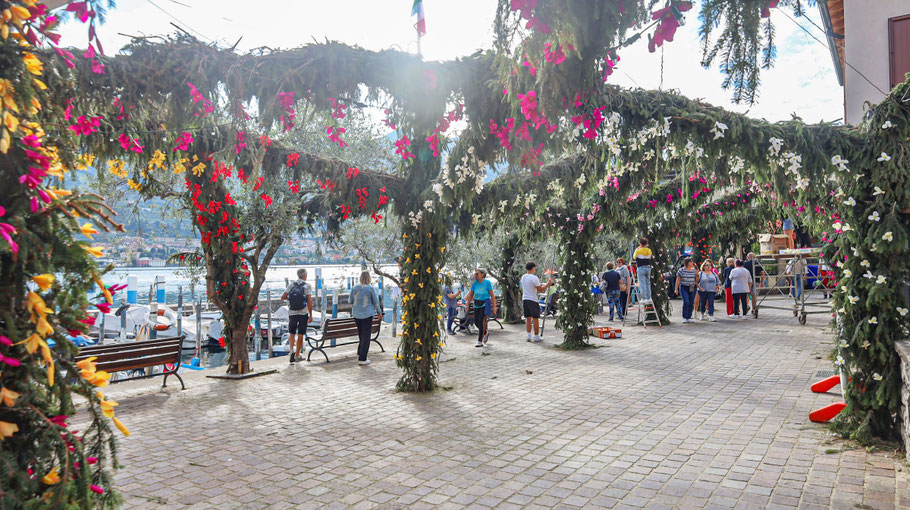 Per questa occasione i vicoli e le piazzette si trasformano in un bosco incantato: arcate di legno ricoperte di rami di pino e fiori coloratissimi.