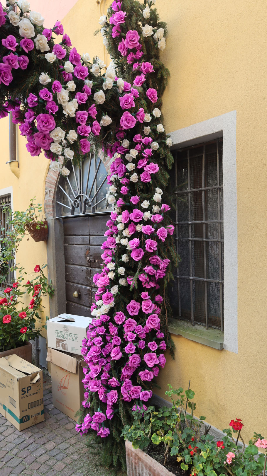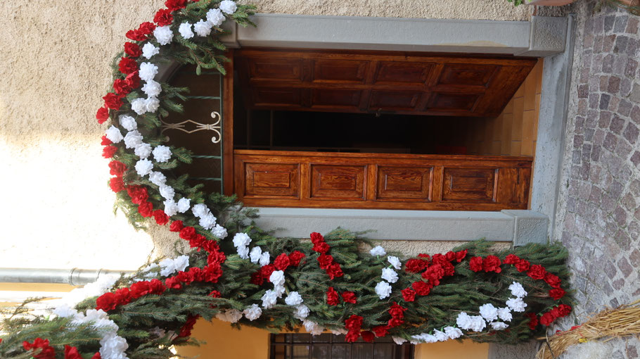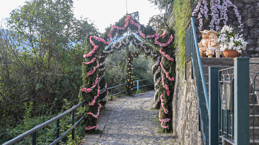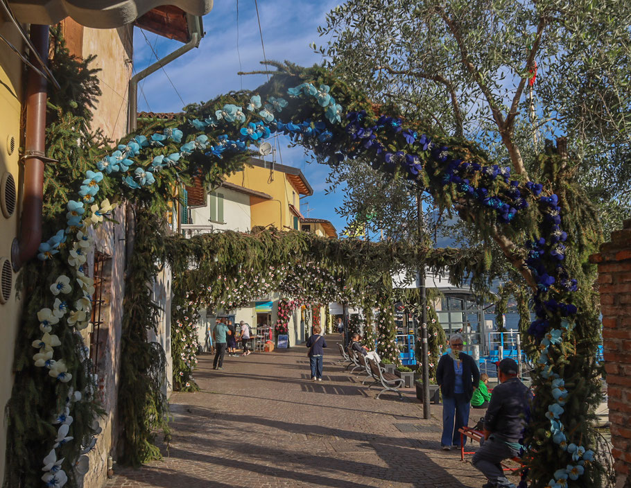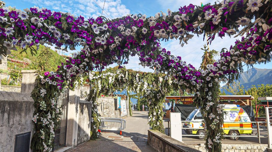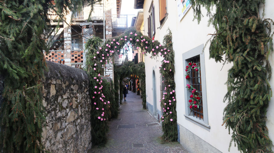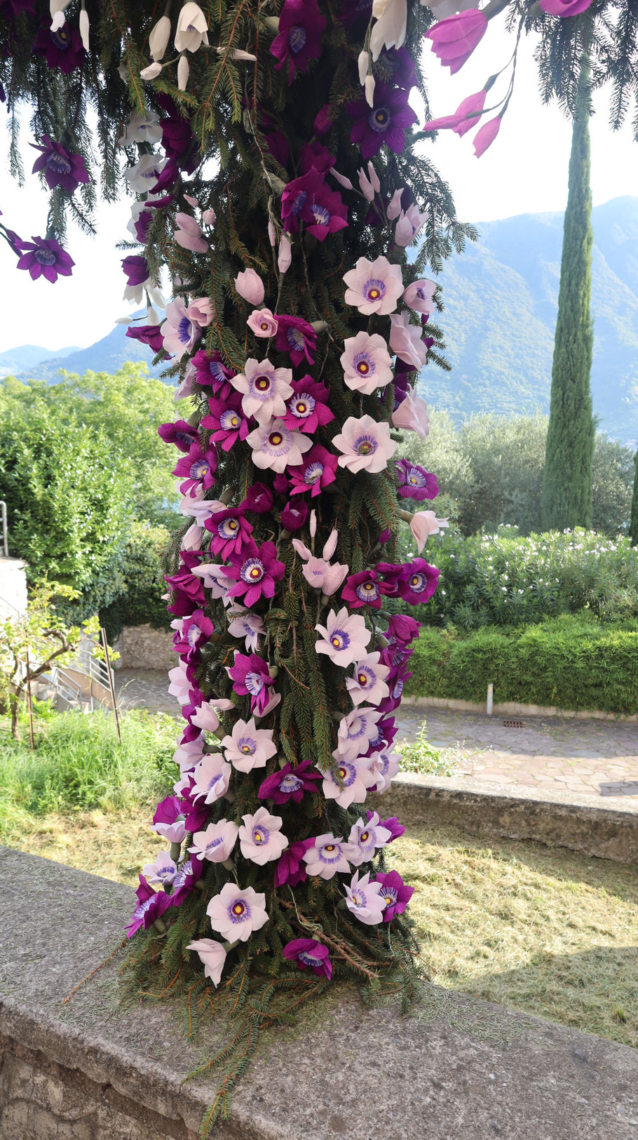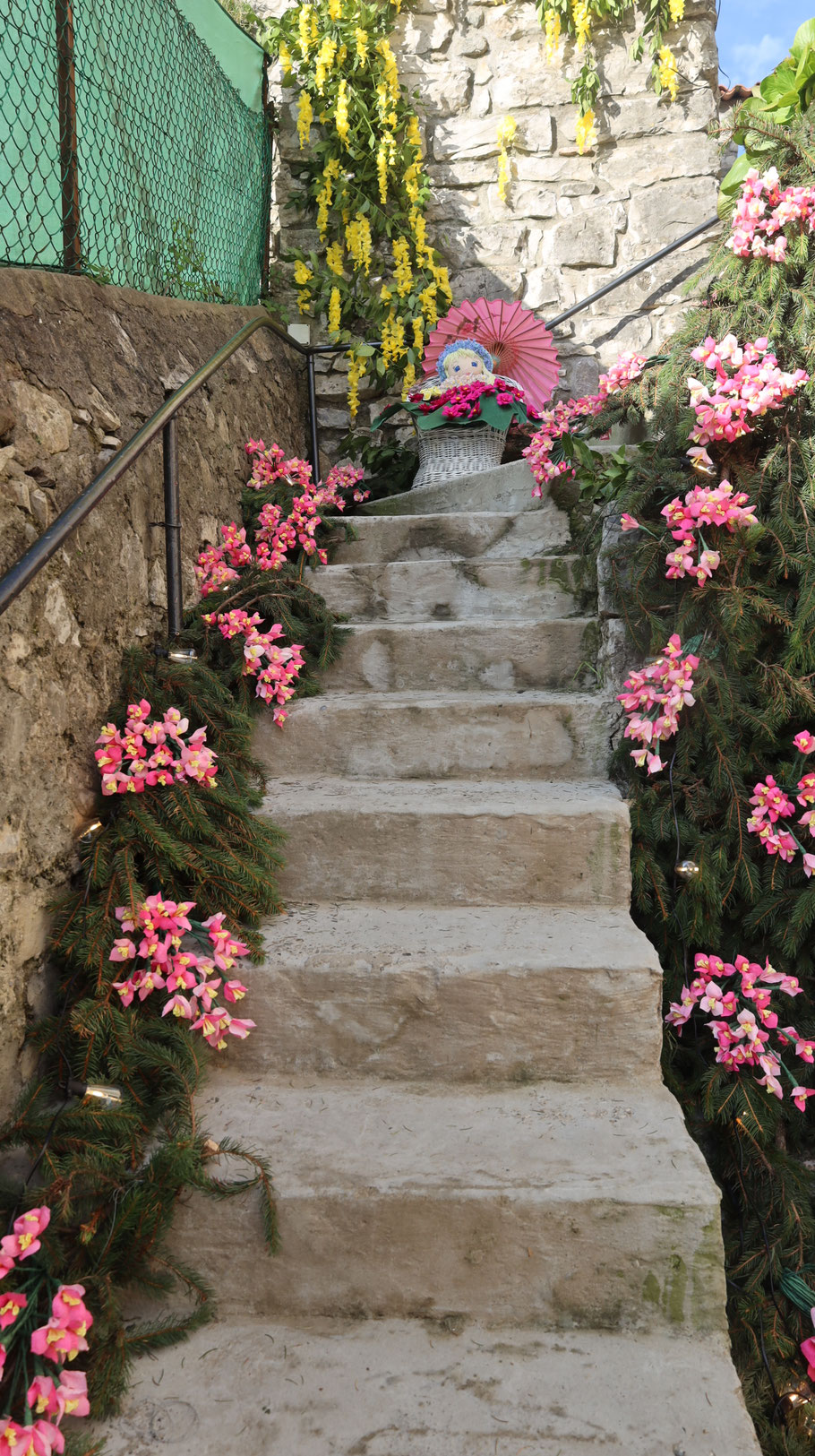 Per questa occasione i vicoli e le piazzette si trasformano in un bosco incantato: arcate di legno ricoperte di rami di pino e fiori coloratissimi.