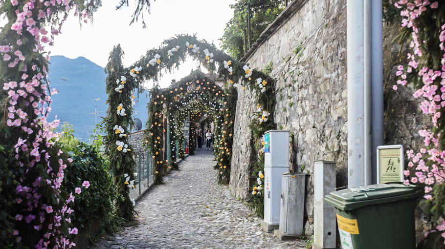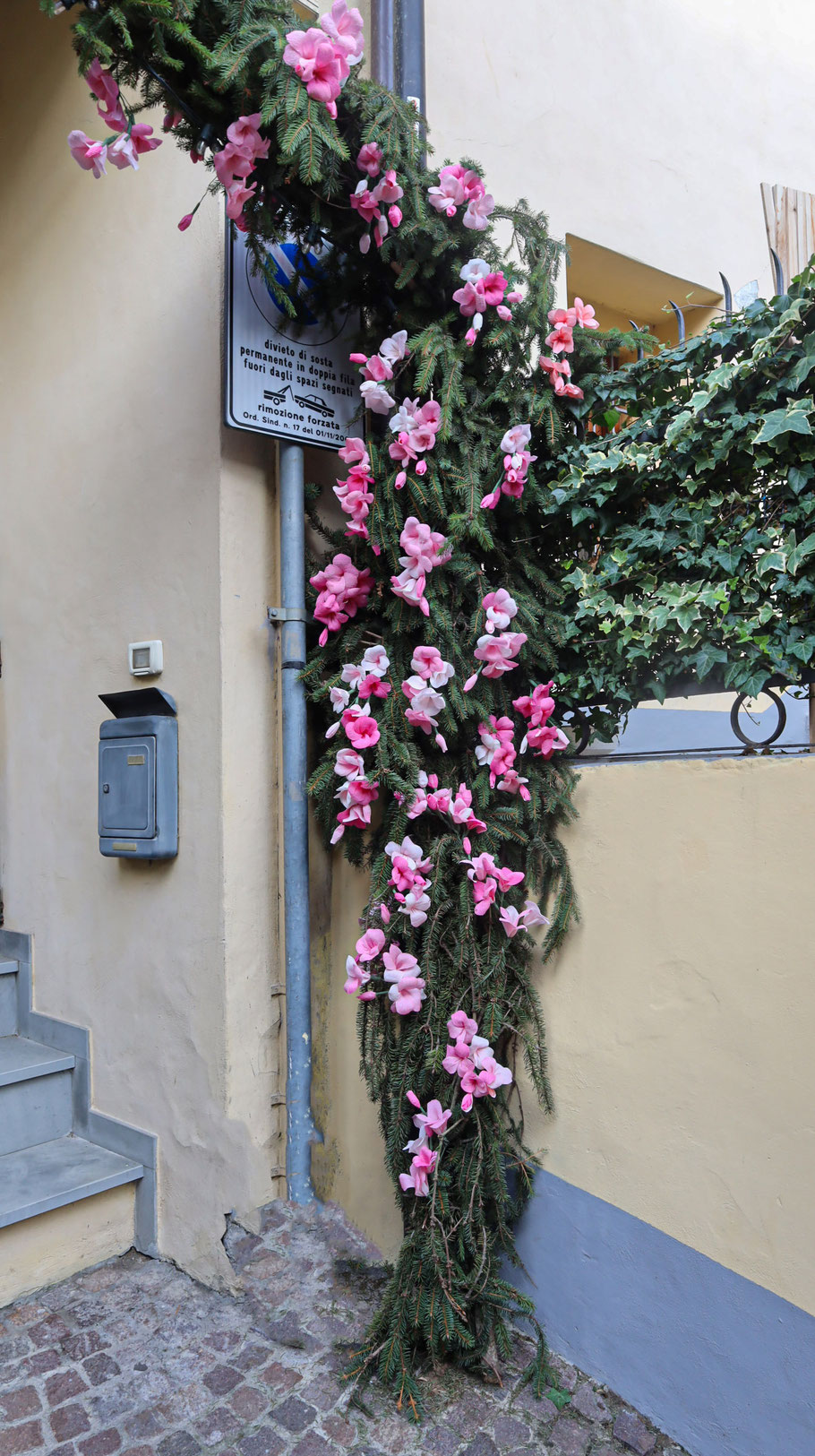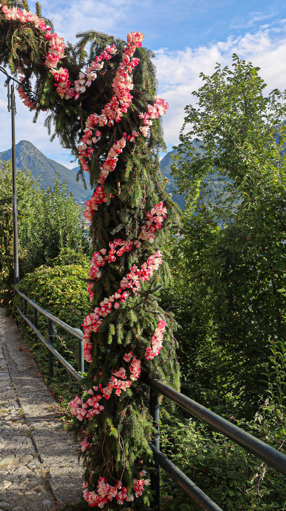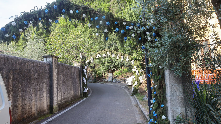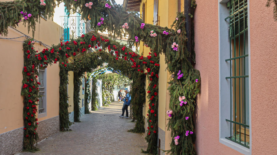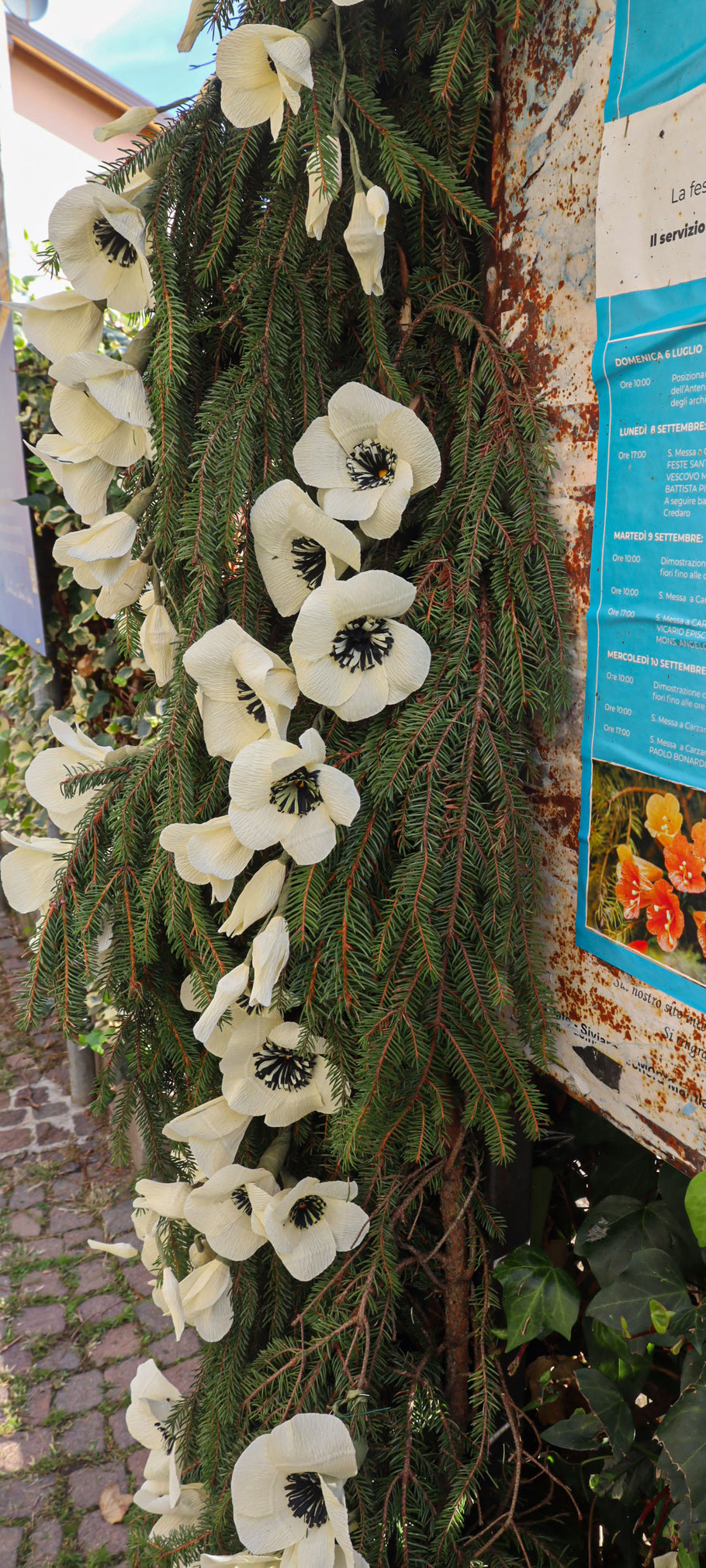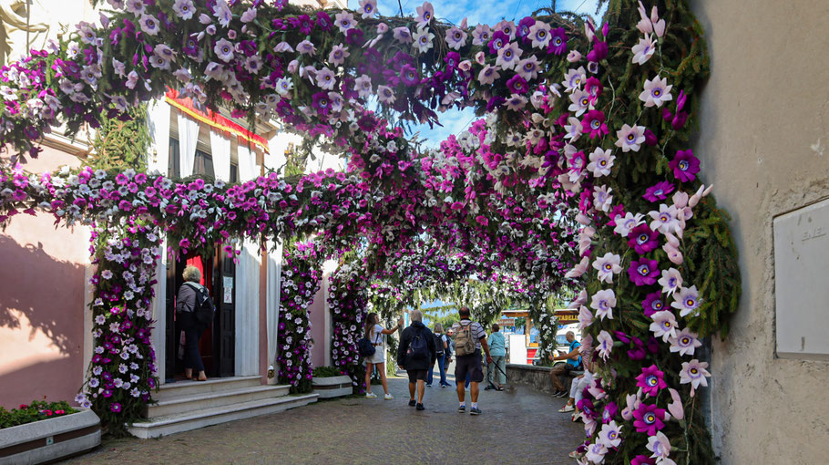 Per questa occasione i vicoli e le piazzette si trasformano in un bosco incantato: arcate di legno ricoperte di rami di pino e fiori coloratissimi.