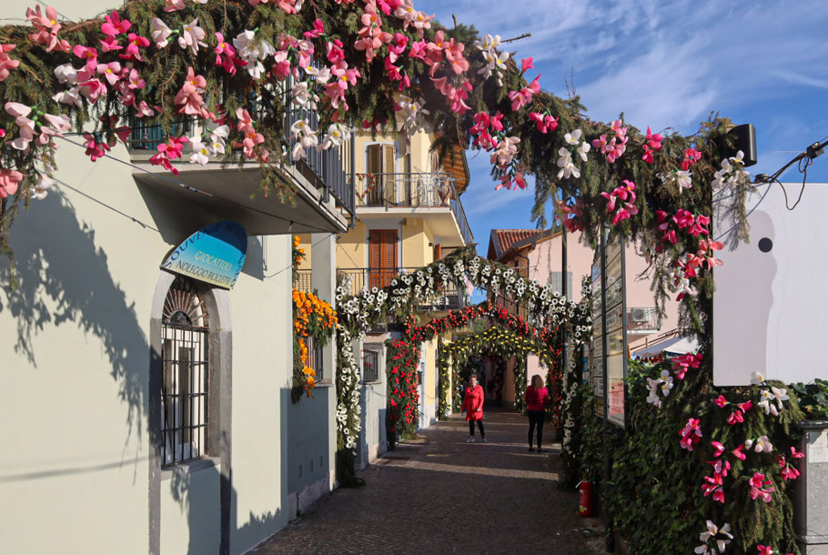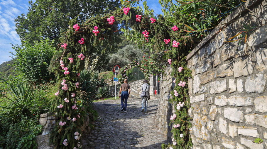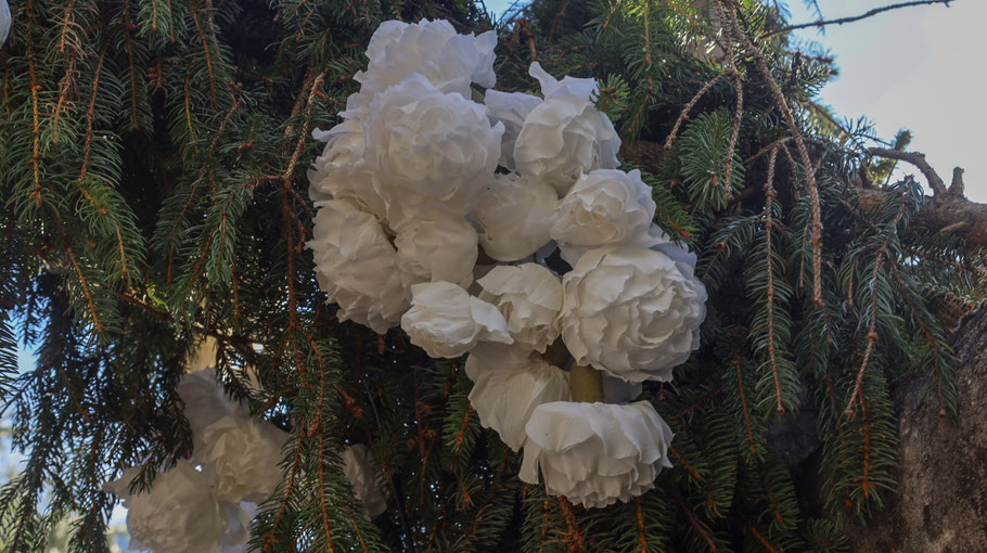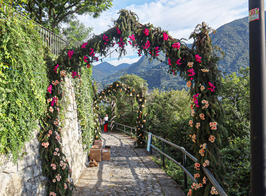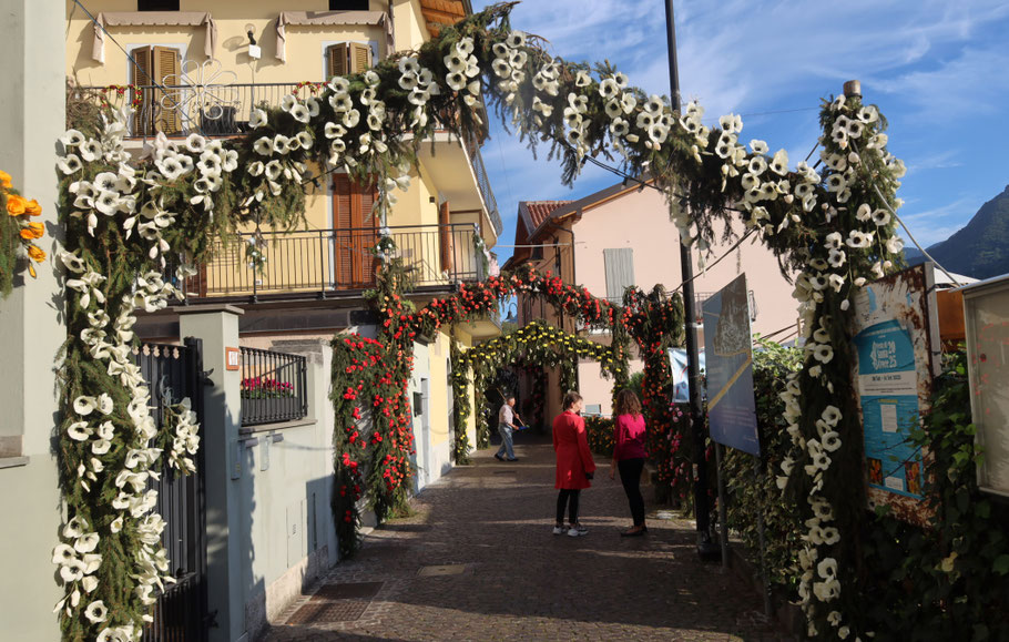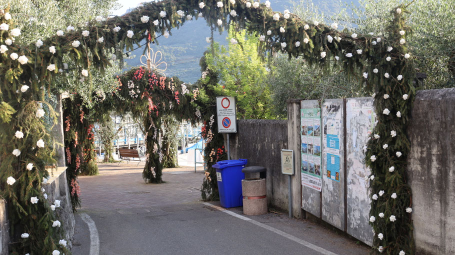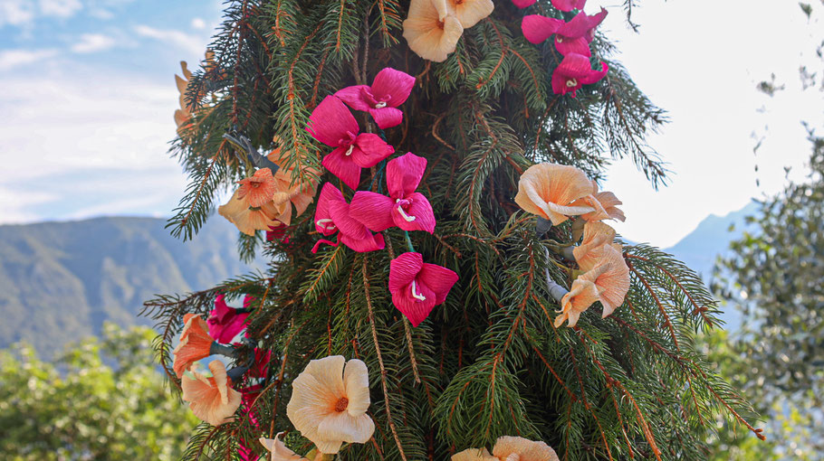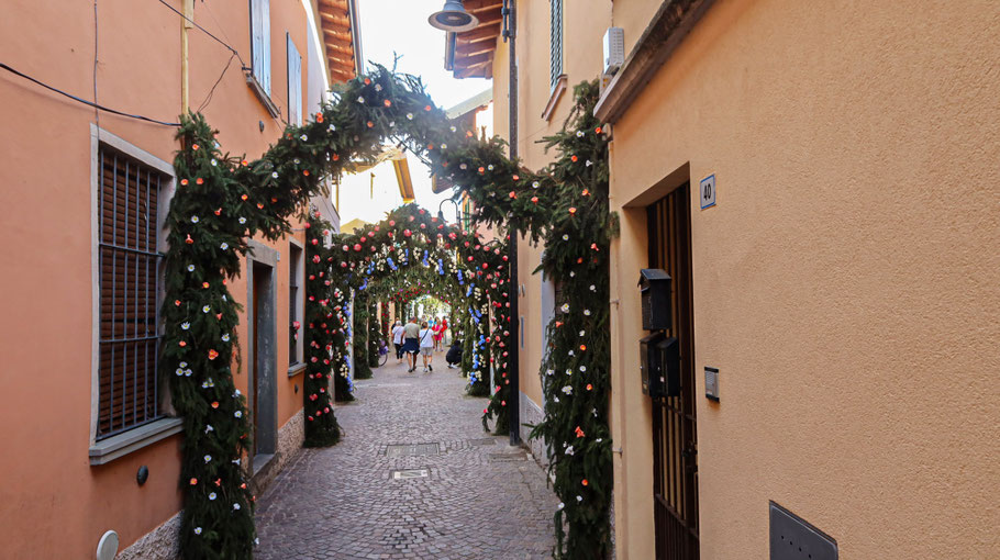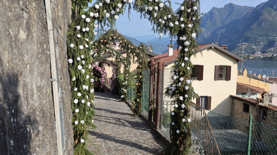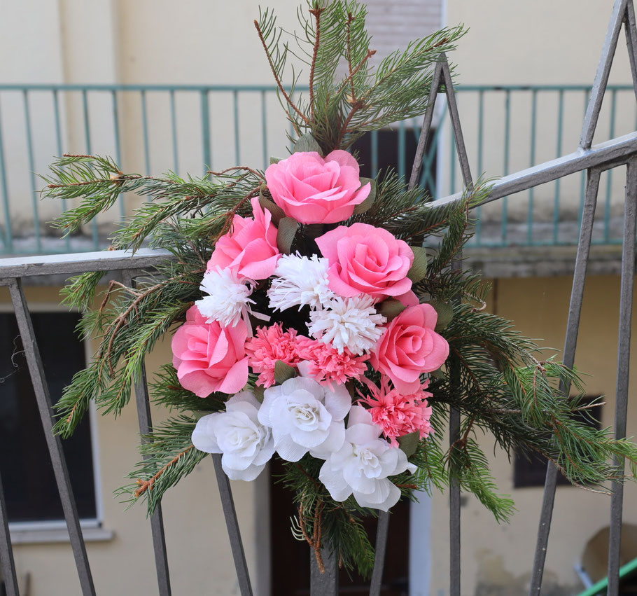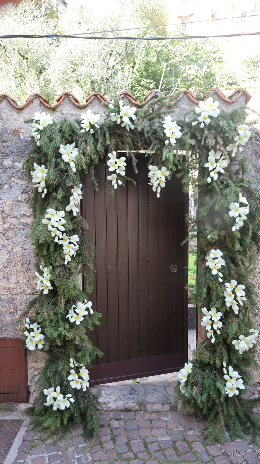 Per questa occasione i vicoli e le piazzette si trasformano in un bosco incantato: arcate di legno ricoperte di rami di pino e fiori coloratissimi.