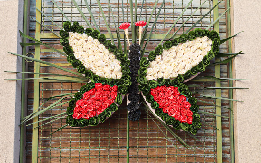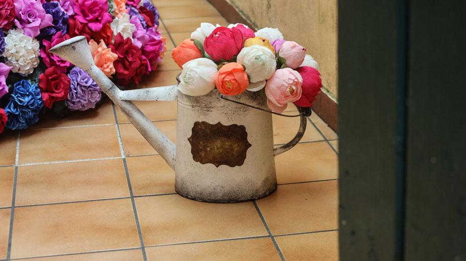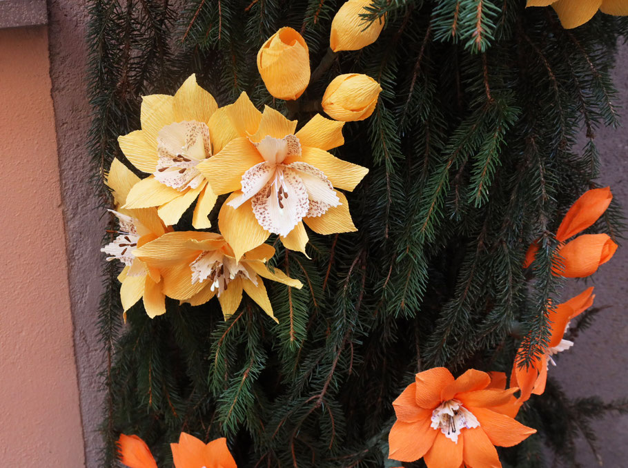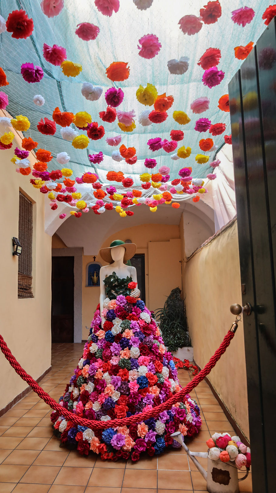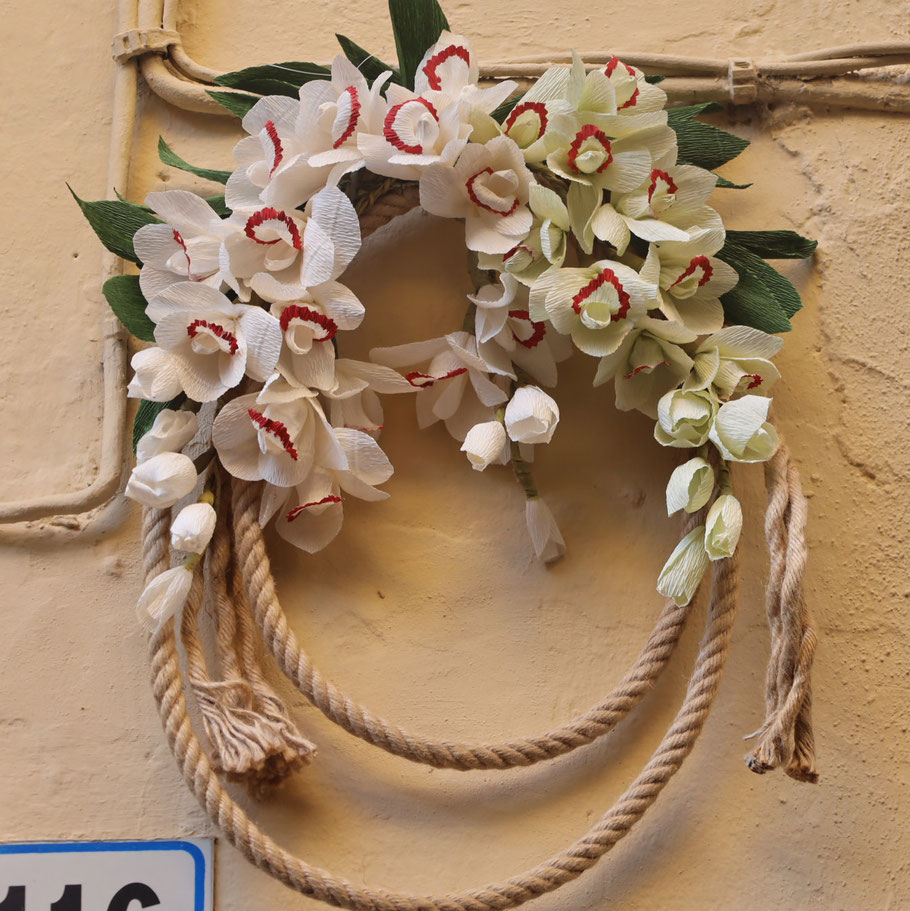 Ogni famiglia decora la propria casa con fiori di carta, spesso mantenendo segreti i modelli fino all’ultimo. La rosa è il fiore simbolo, ma si trovano anche orchidee, viole, clematidi e glicini.